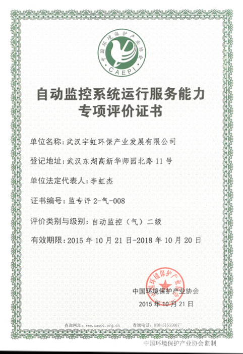 近日,武漢宇虹環(huán)保產(chǎn)業(yè)發(fā)展有限公司獲得由中國環(huán)保產(chǎn)業(yè)協(xié)會頒發(fā)的自動監(jiān)控系統(tǒng)運(yùn)行服務(wù)能力專項(xiàng)評價證書—自動監(jiān)控(氣)二級。